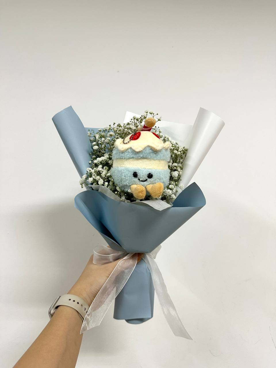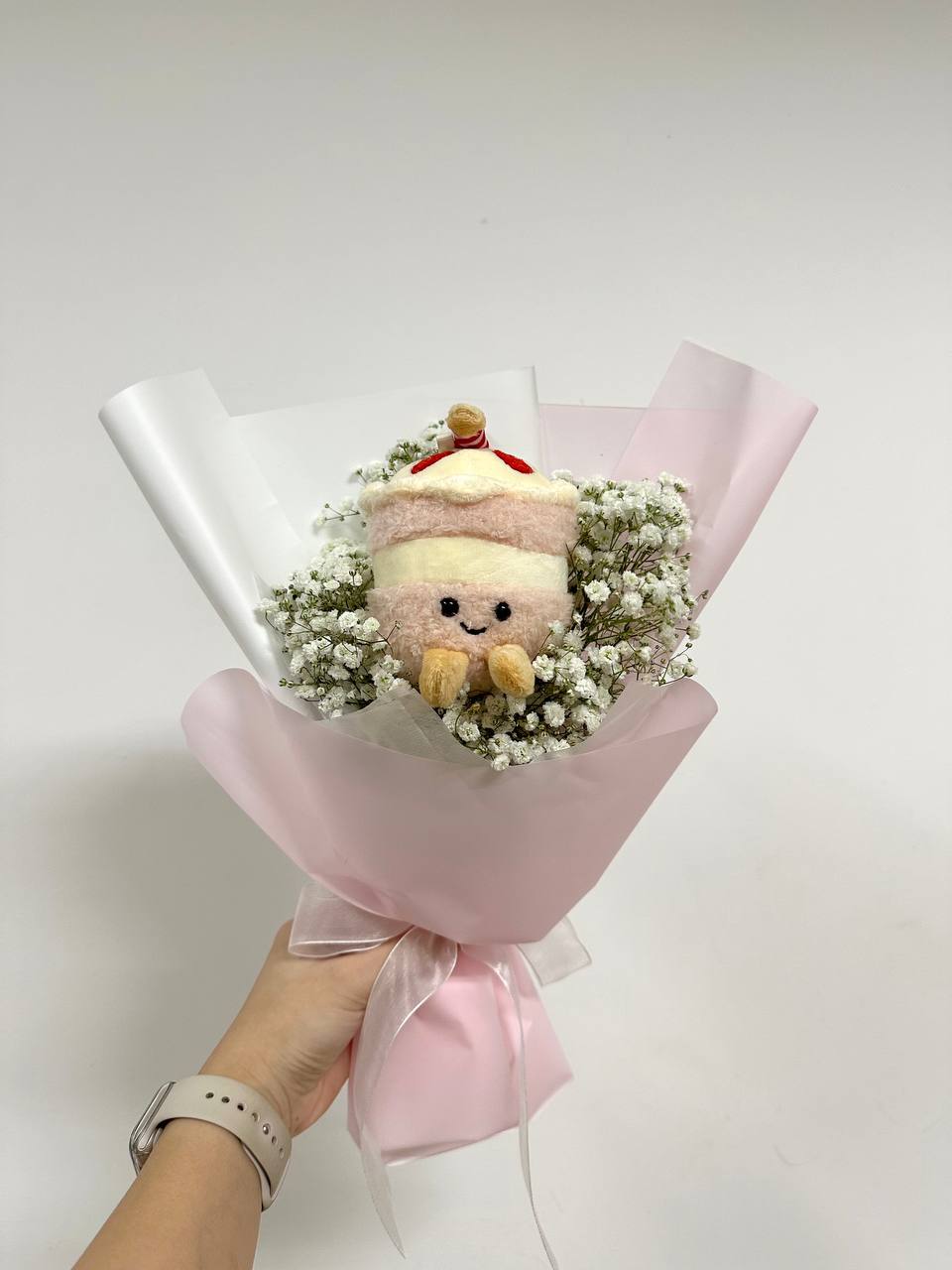A charming plush bouquet featuring an adorable cake and cloud plushie surrounded by delicate baby’s breath and wrapped in soft pastel tones. The perfect gift for Valentine's!